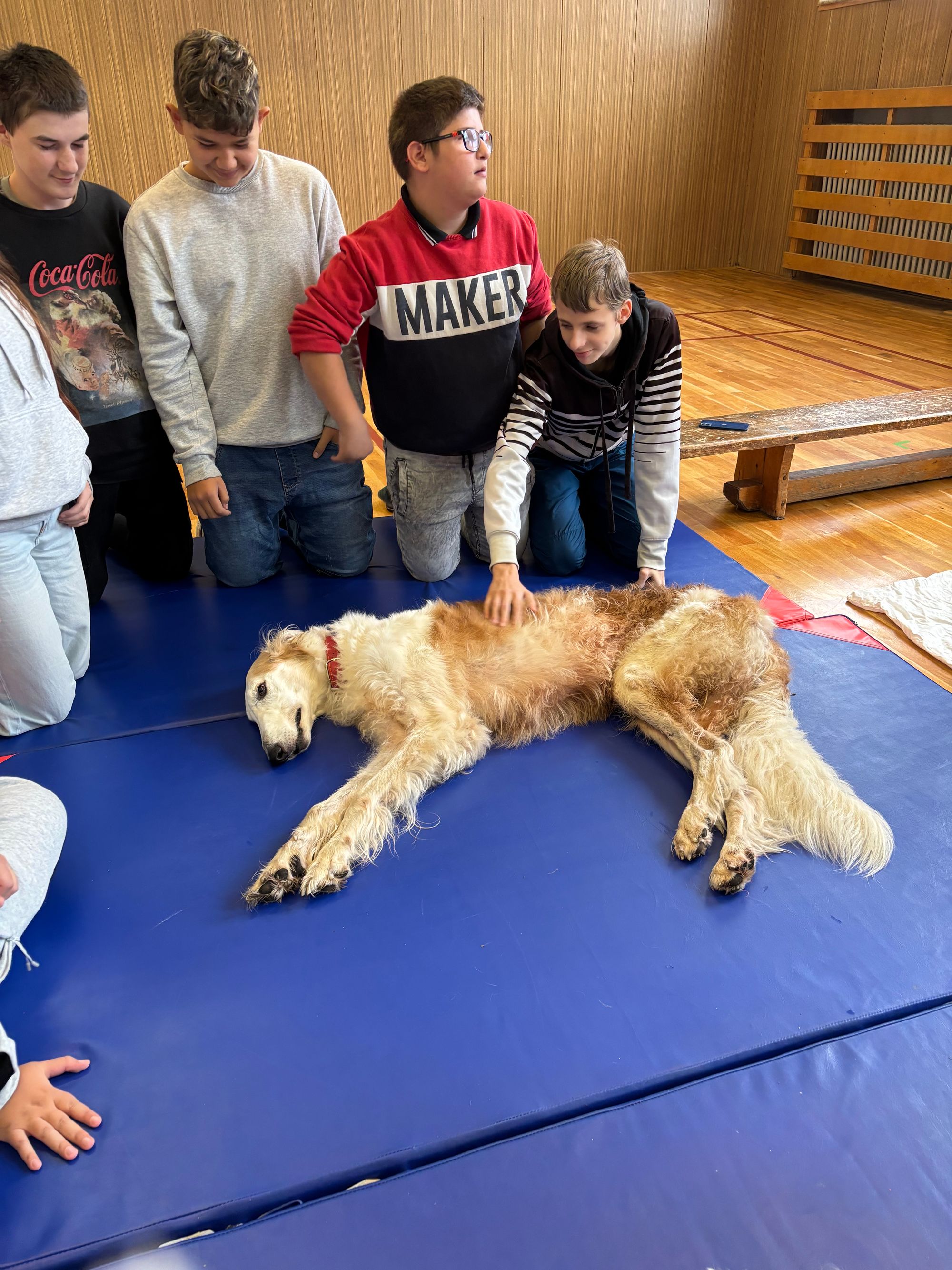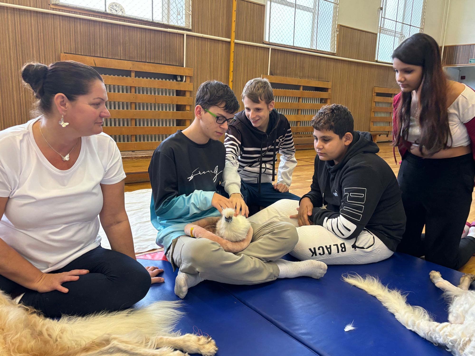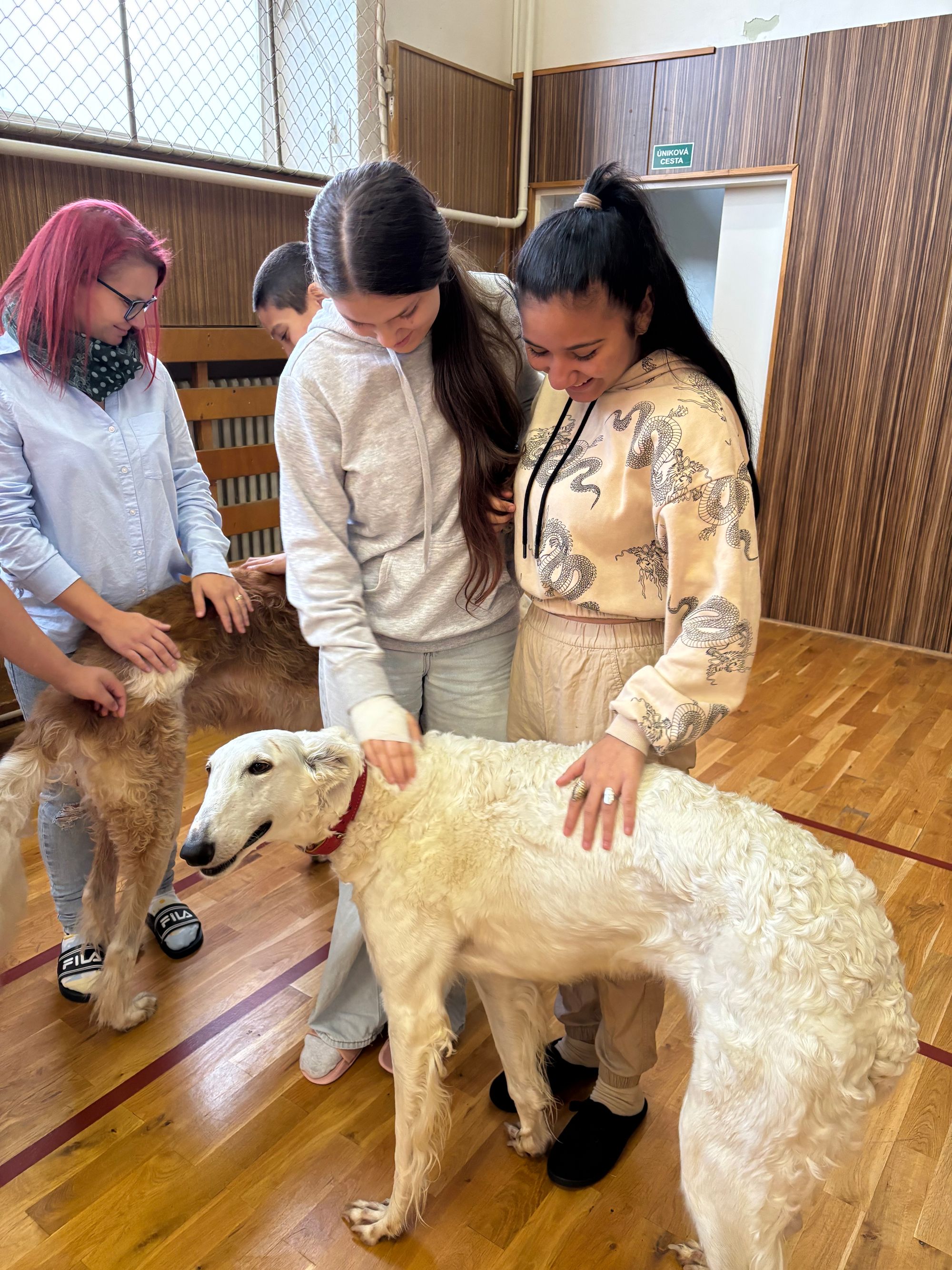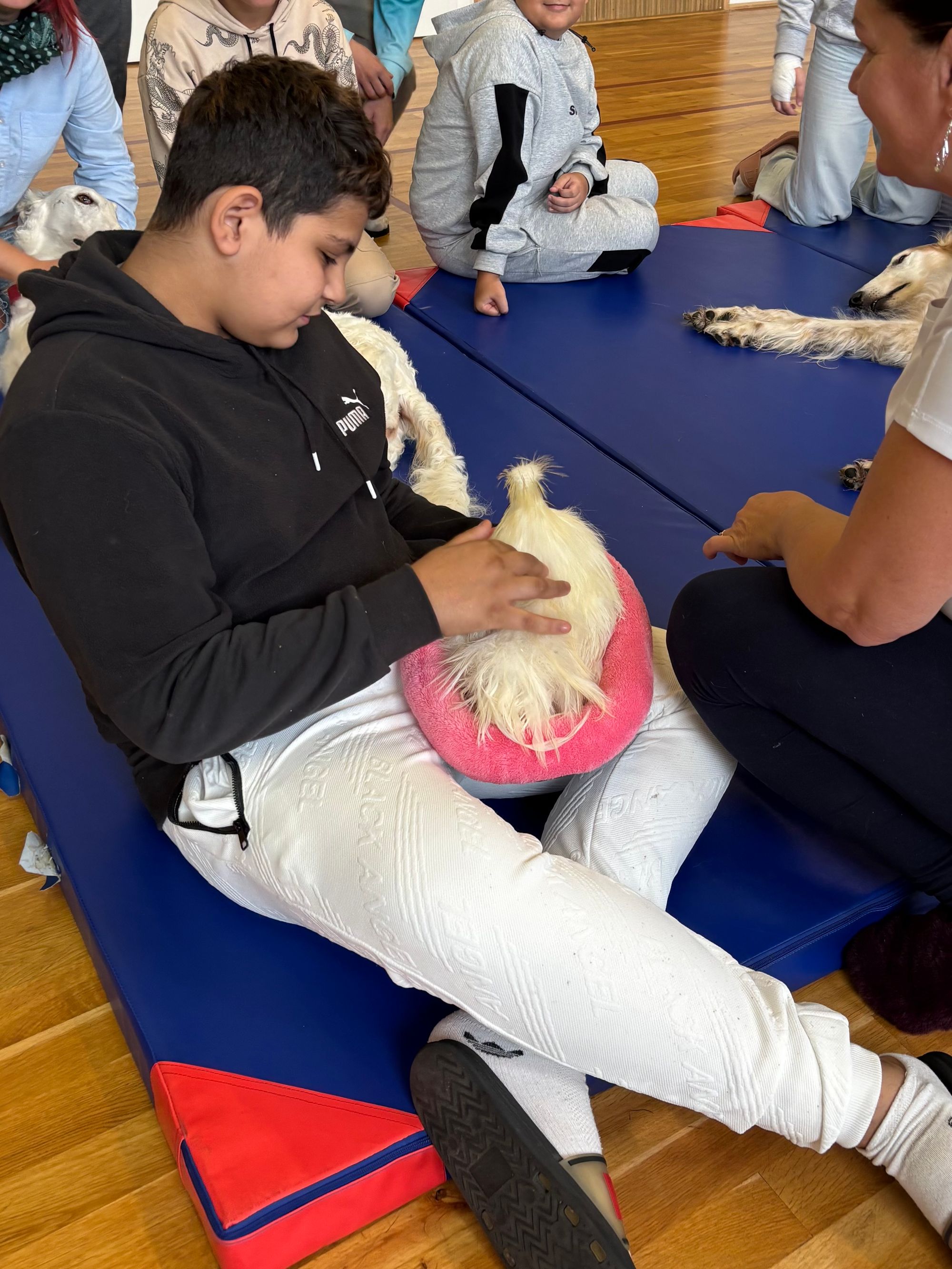Na naší škole proběhla canisterapie, tentokrát poprvé i pro žáky 2. stupně praktických tříd. Do školy zavítali dva ruští chrti, kteří si okamžitě získali pozornost a sympatie všech žáků. Také slepičky hedvábničky, které děti mohly pohladit a pozorovat zblízka. Canisterapie pomáhá nejen rozvíjet vztah ke zvířatům, ale má i pozitivní vliv na psychiku a uvolnění svalů. Paní terapeutka byla velmi milá a trpělivá, vše dětem hezky vysvětlila a umožnila jim se do programu aktivně zapojit. O zábavný okamžik se postarala i jedna slepička, která během návštěvy hodila malý bobek, což vyvolalo mezi dětmi spoustu smíchu. Žáci si program velmi užili a už se těší na další setkání se zvířecími terapeuty.