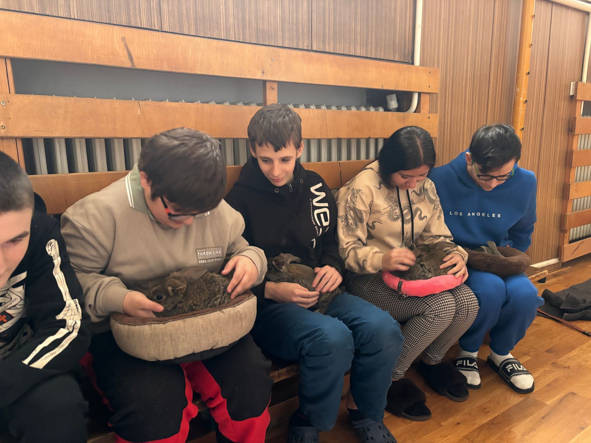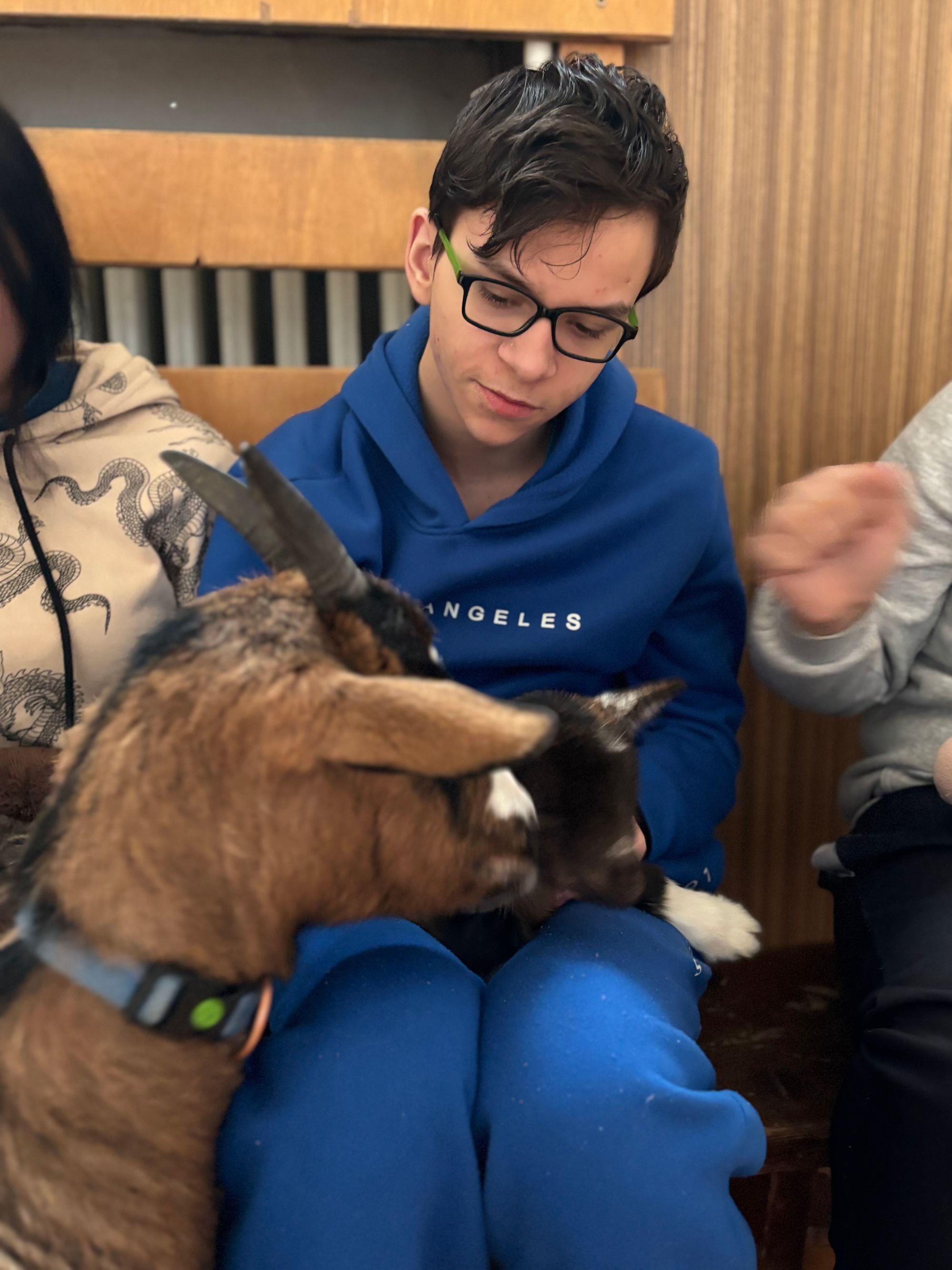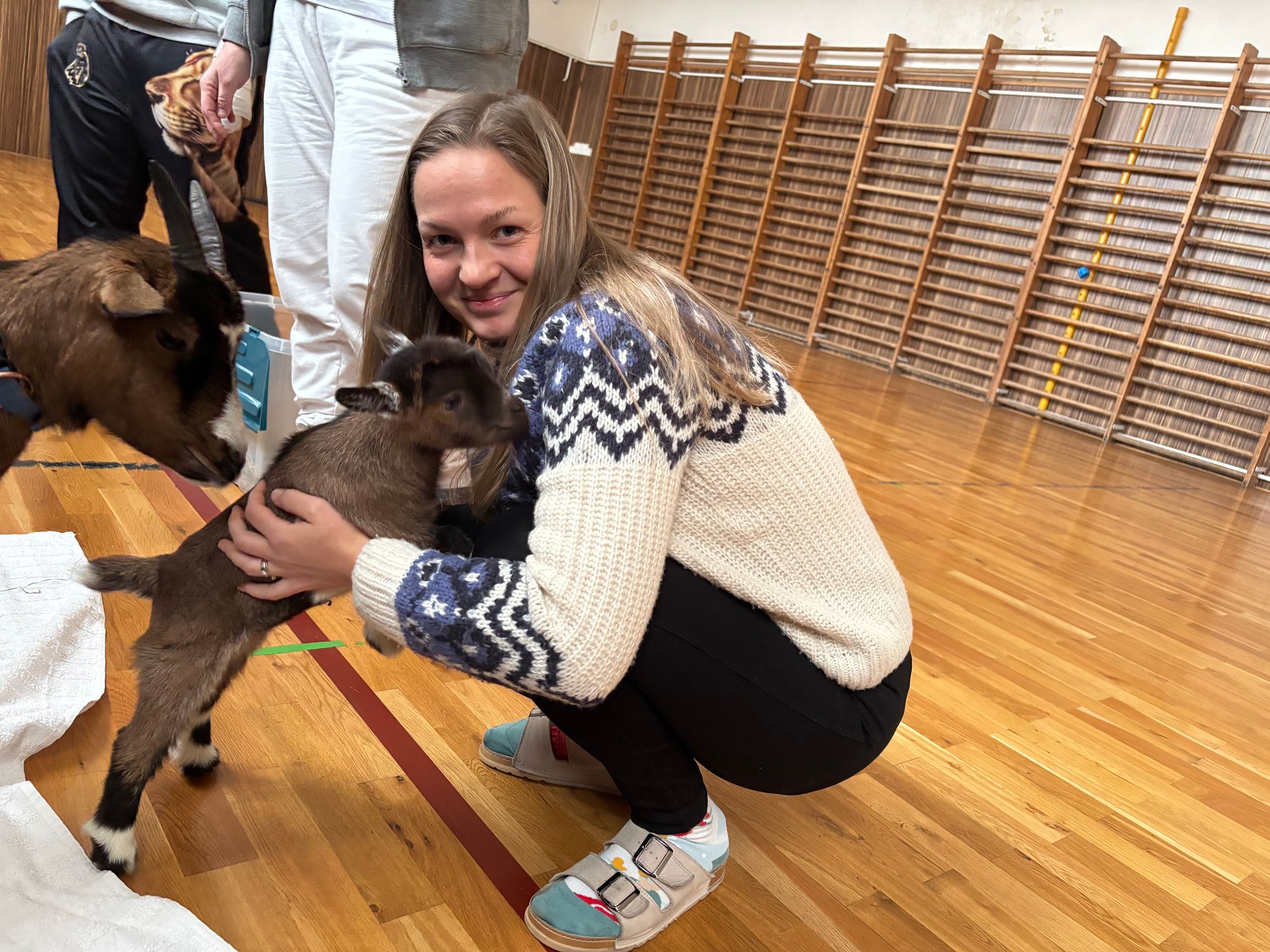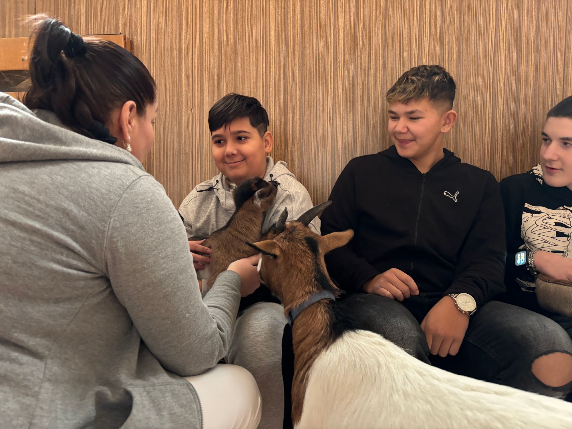 Dnešní canisterapie byla výjimečná svou rozmanitostí. Žáci se setkali s holandskou zakrslou kozou – maminkou i jejím mládětem, které bylo staré pouhý jeden týden. Tichý respekt s jakým děti ke zvířatům přistupovaly, byl sám o sobě důkazem, jak silný účinek může mít živý kontakt s přírodou. Mezi další terapeuty patřilo sedm hebkých králíčků, jako plyšáci, kteří si okamžitě získali srdce všech přítomných. Žáci si mohli zvířata pohladit, pozorovat jejich chování a vnímat jejich klidnou energii.