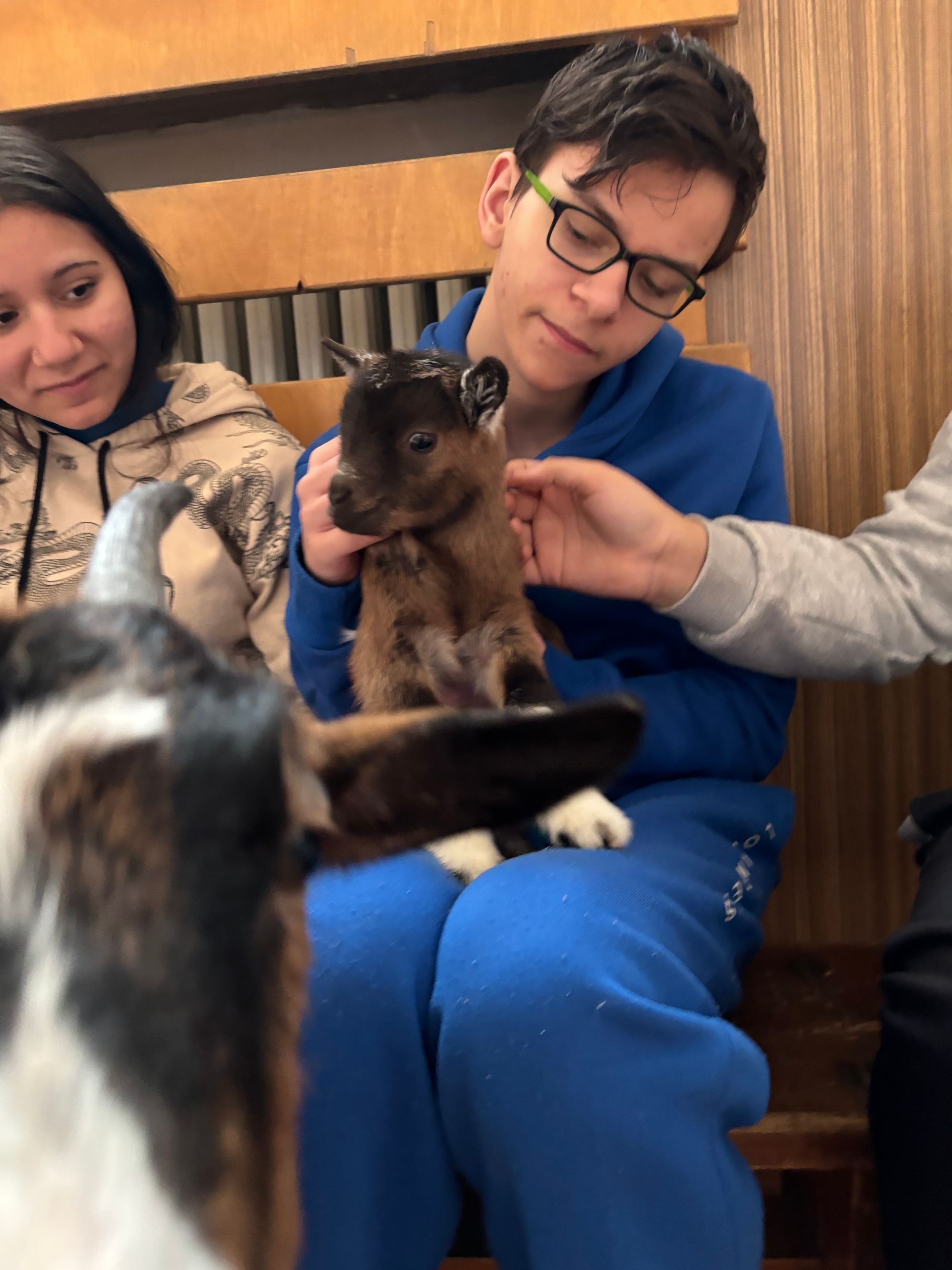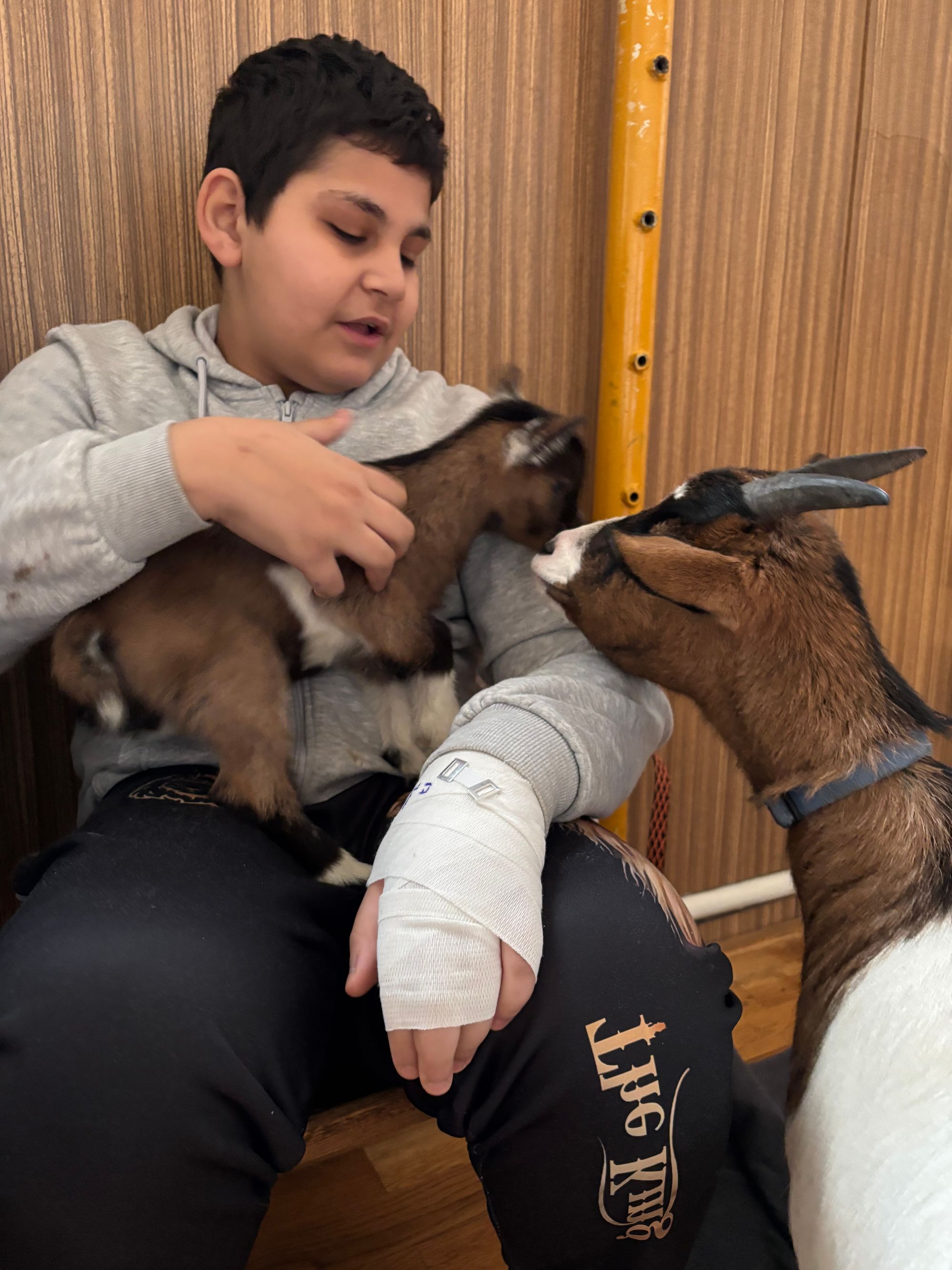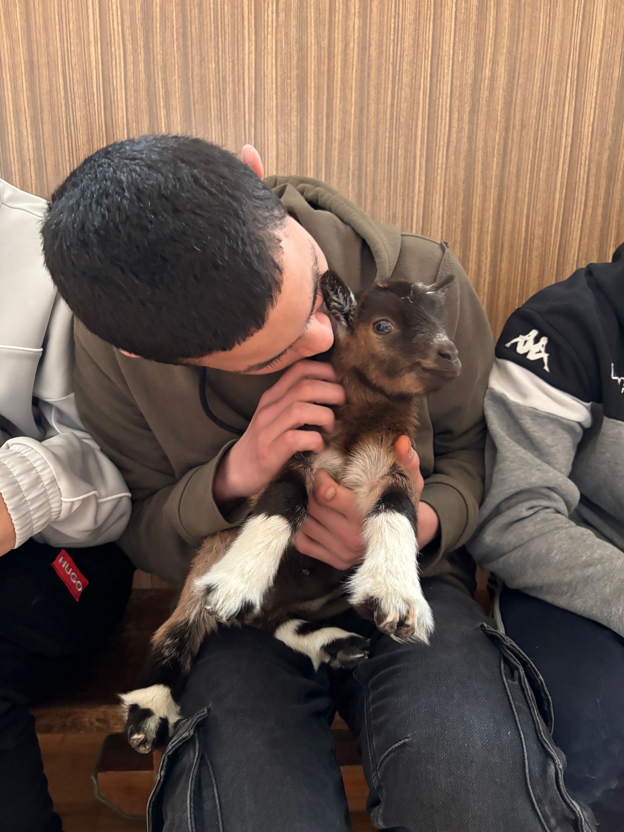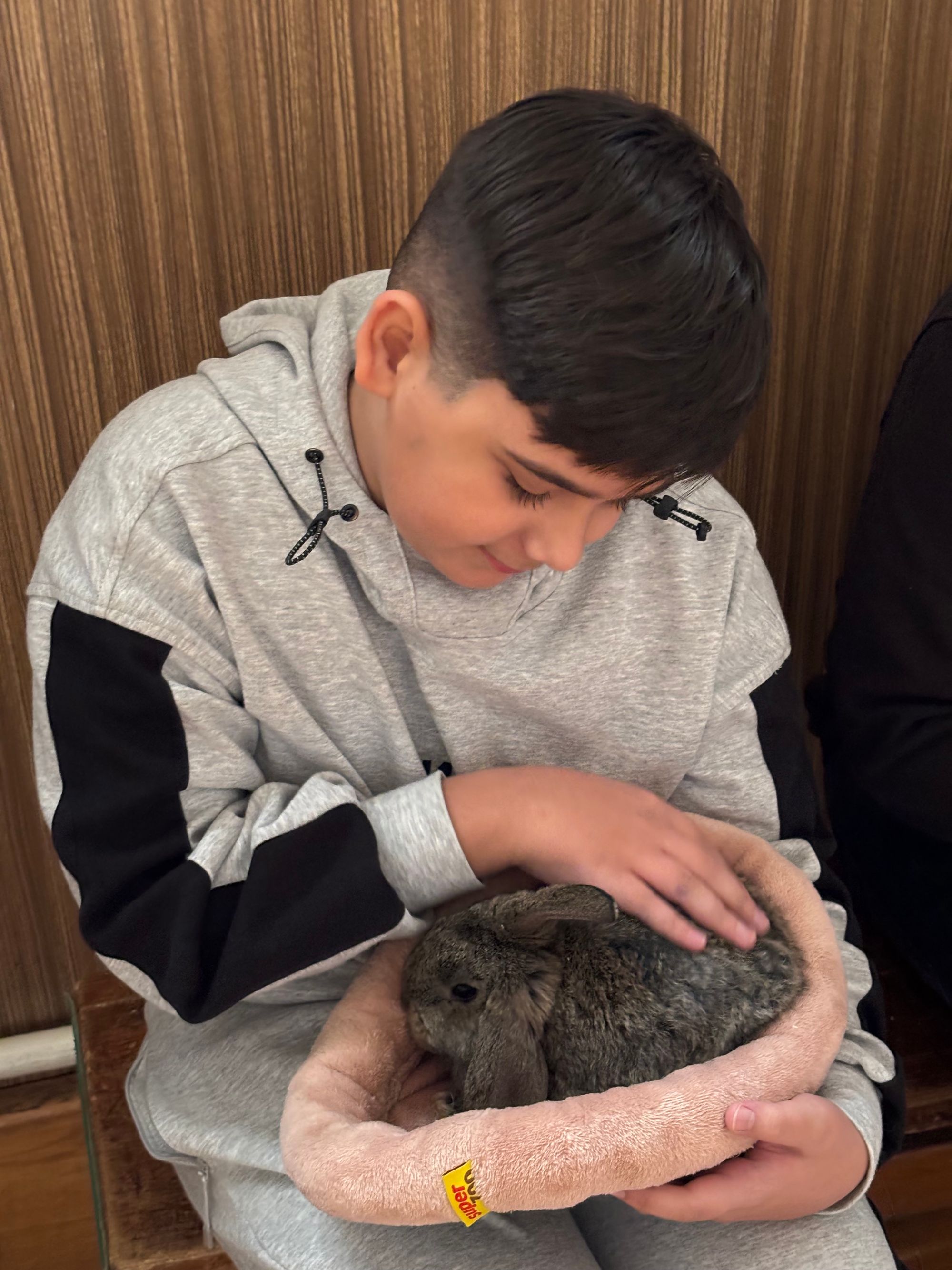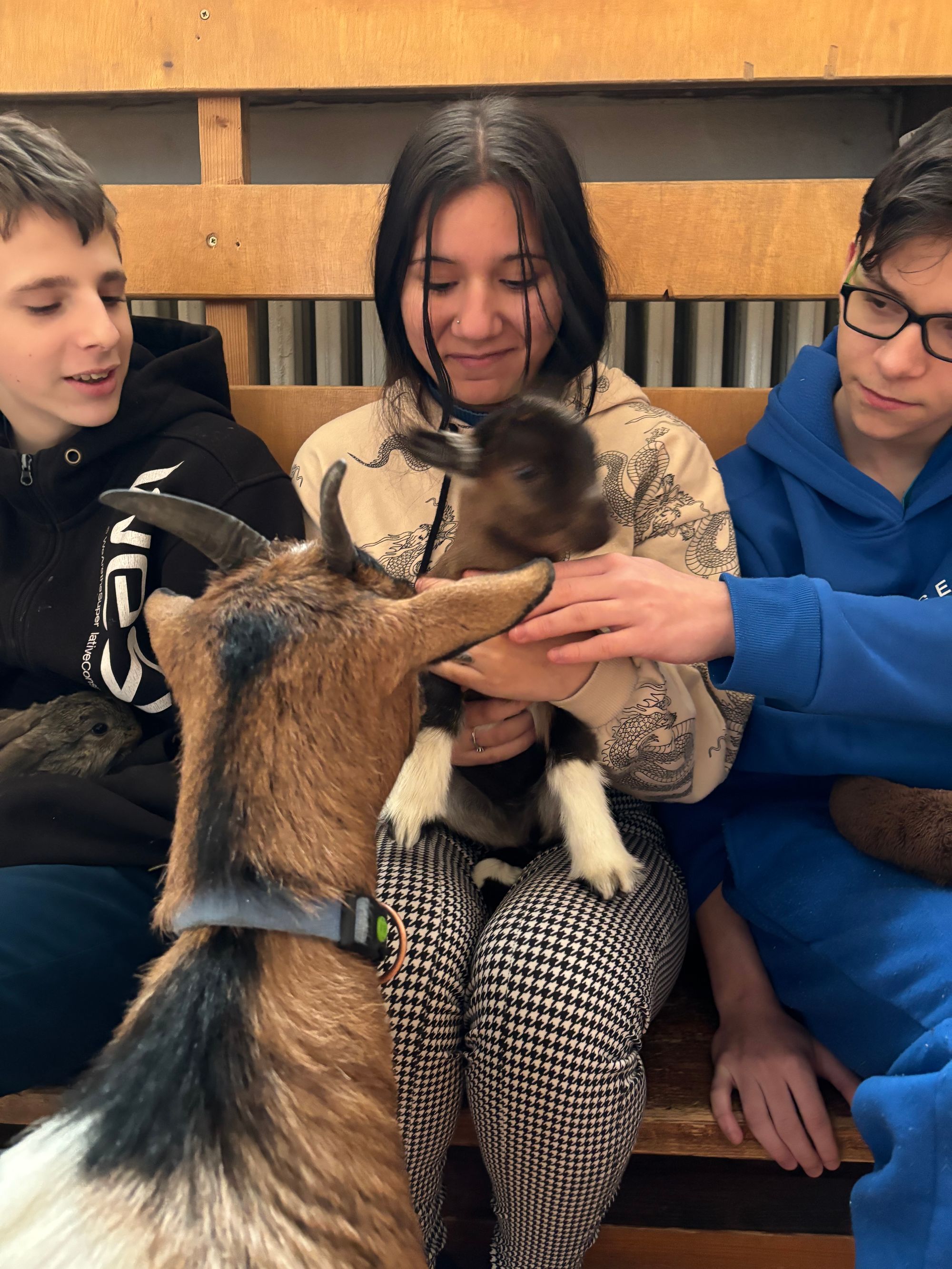 Dnešní canisterapie byla výjimečná svou rozmanitostí. Žáci se setkali s holandskou zakrslou kozou – maminkou i jejím mládětem, které bylo staré pouhý jeden týden. Tichý respekt s jakým děti ke zvířatům přistupovaly, byl sám o sobě důkazem, jak silný účinek může mít živý kontakt s přírodou. Mezi další terapeuty patřilo sedm hebkých králíčků, jako plyšáci, kteří si okamžitě získali srdce všech přítomných. Žáci si mohli zvířata pohladit, pozorovat jejich chování a vnímat jejich klidnou energii.