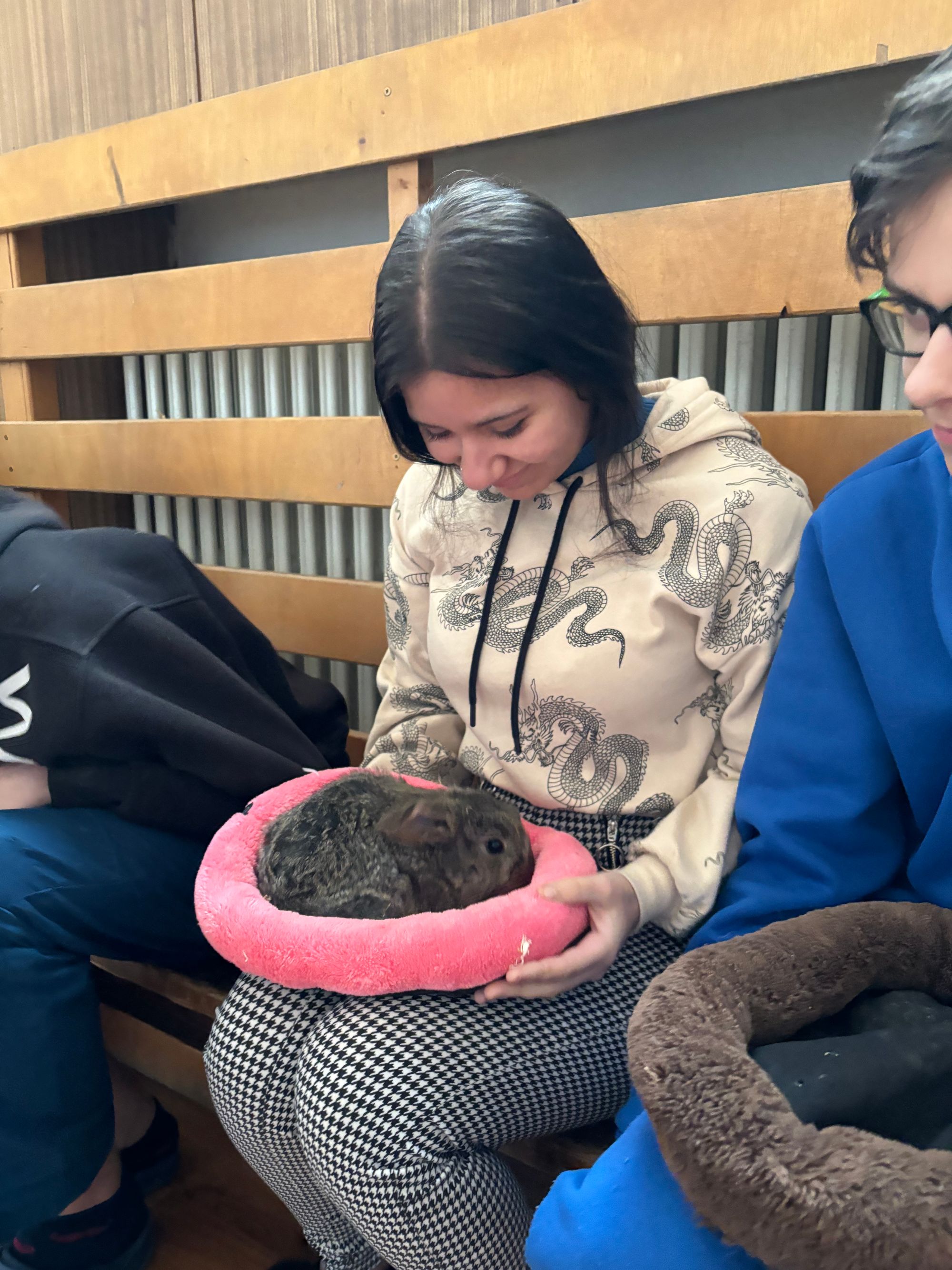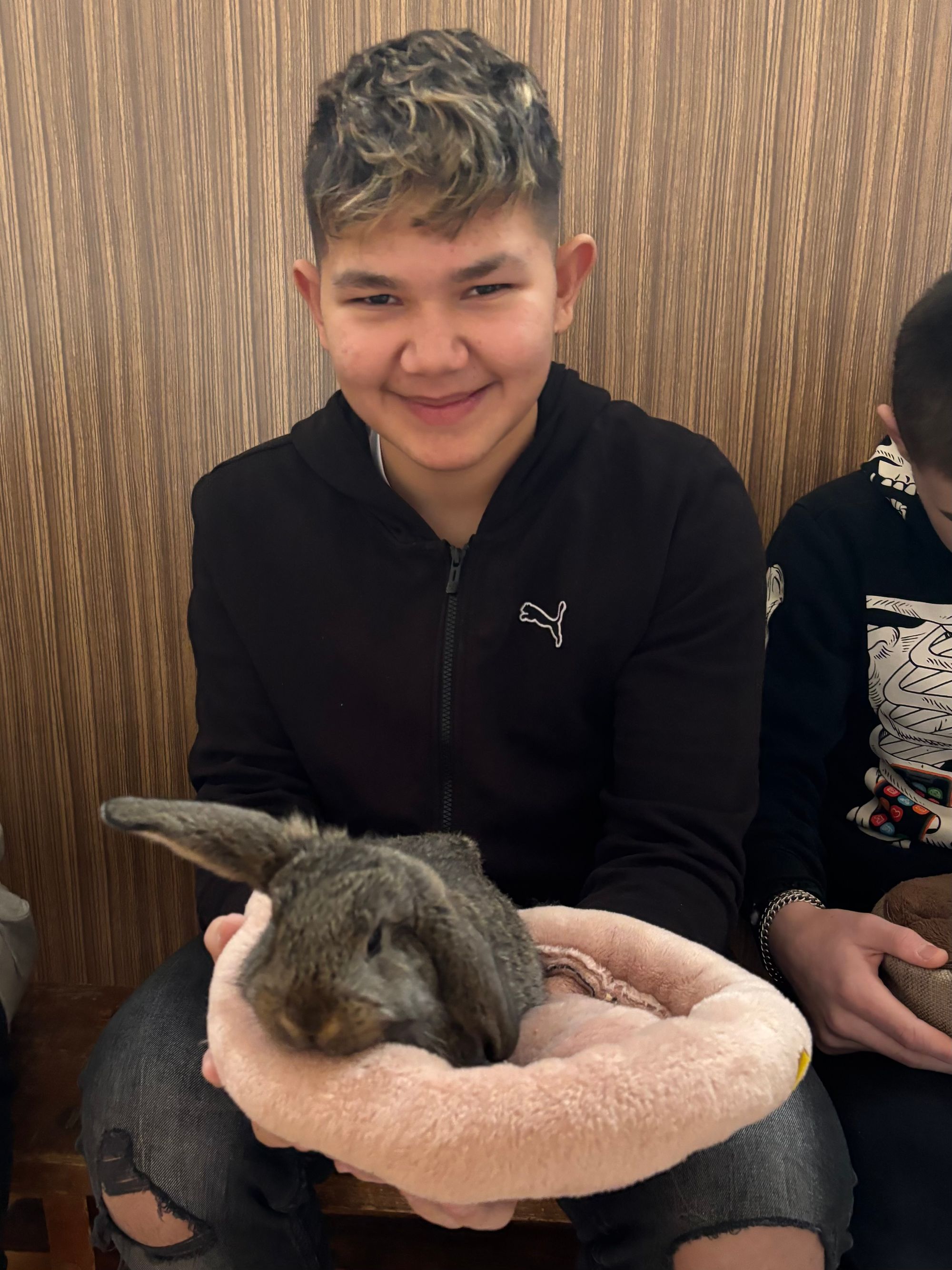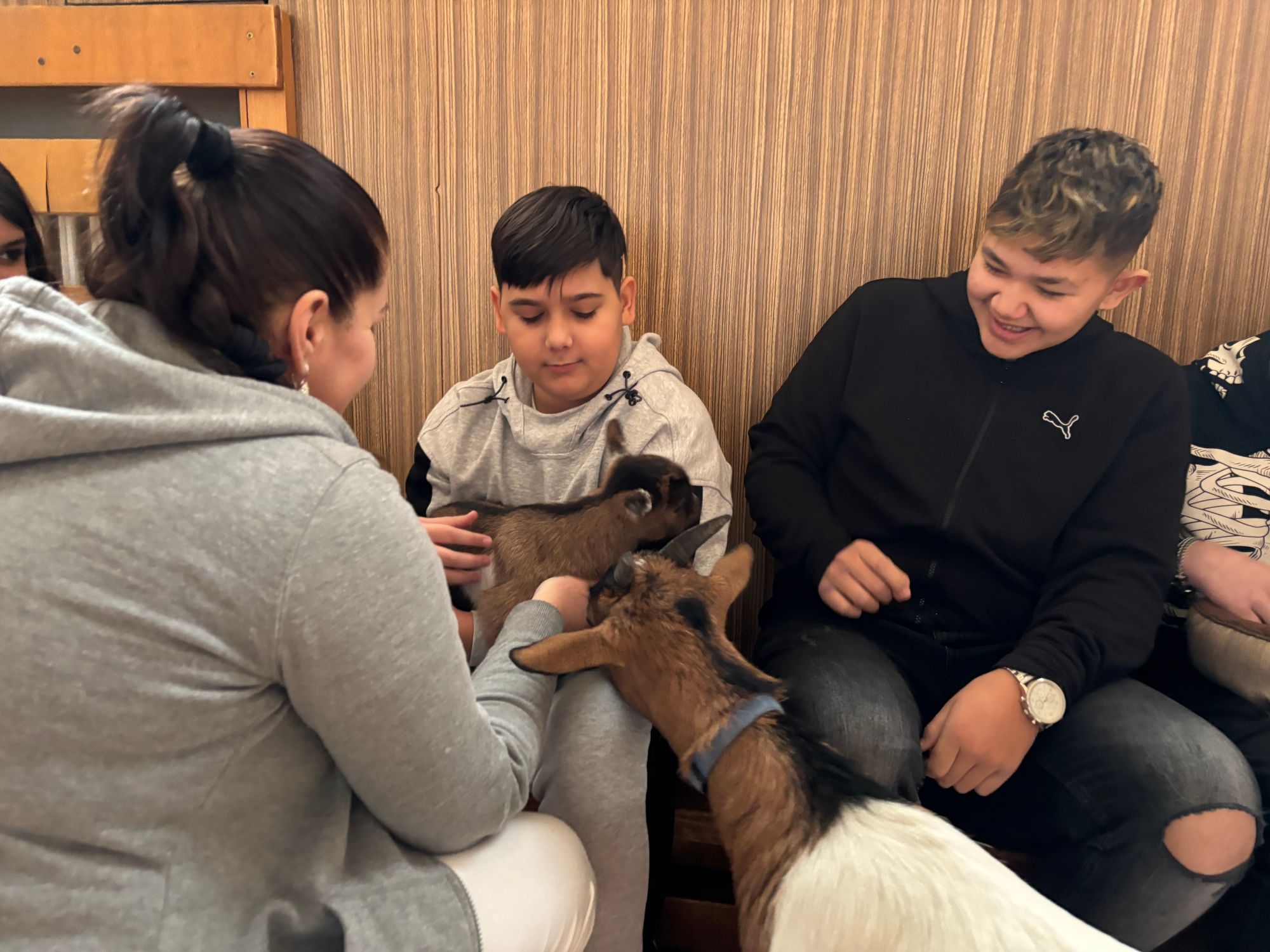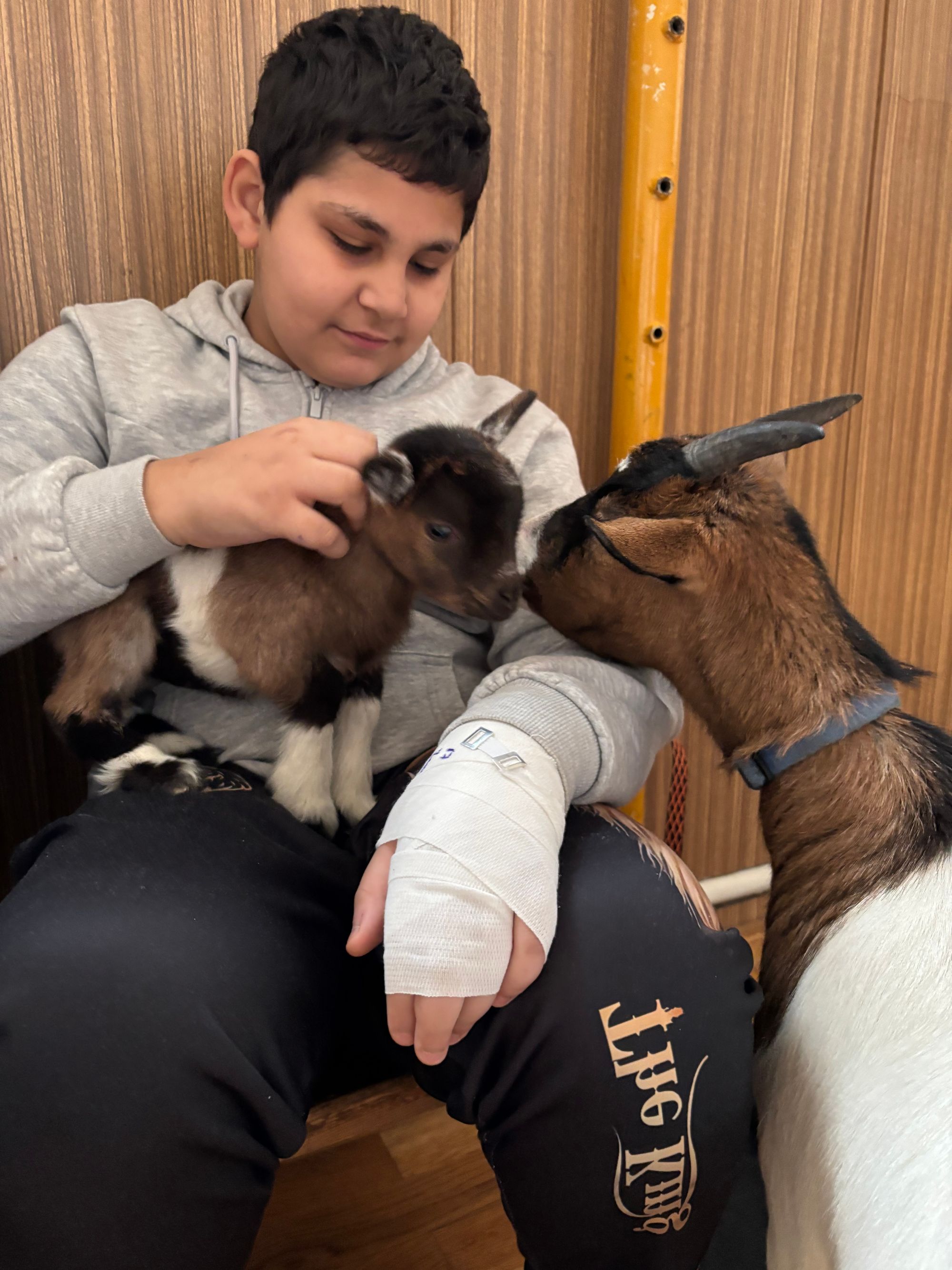 Dnešní canisterapie byla výjimečná svou rozmanitostí. Žáci se setkali s holandskou zakrslou kozou – maminkou i jejím mládětem, které bylo staré pouhý jeden týden. Tichý respekt s jakým děti ke zvířatům přistupovaly, byl sám o sobě důkazem, jak silný účinek může mít živý kontakt s přírodou. Mezi další terapeuty patřilo sedm hebkých králíčků, jako plyšáci, kteří si okamžitě získali srdce všech přítomných. Žáci si mohli zvířata pohladit, pozorovat jejich chování a vnímat jejich klidnou energii.